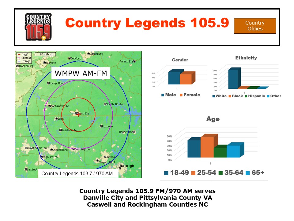 Country Legends 105.9 is Danville’s Home of the Country Legends . . . Country Anthems from the 80s, 90s and More, from legends like Johnny Cash, Reba McEntire, Alan Jackson, George Jones, Faith Hill, Kenny Chesney and more!