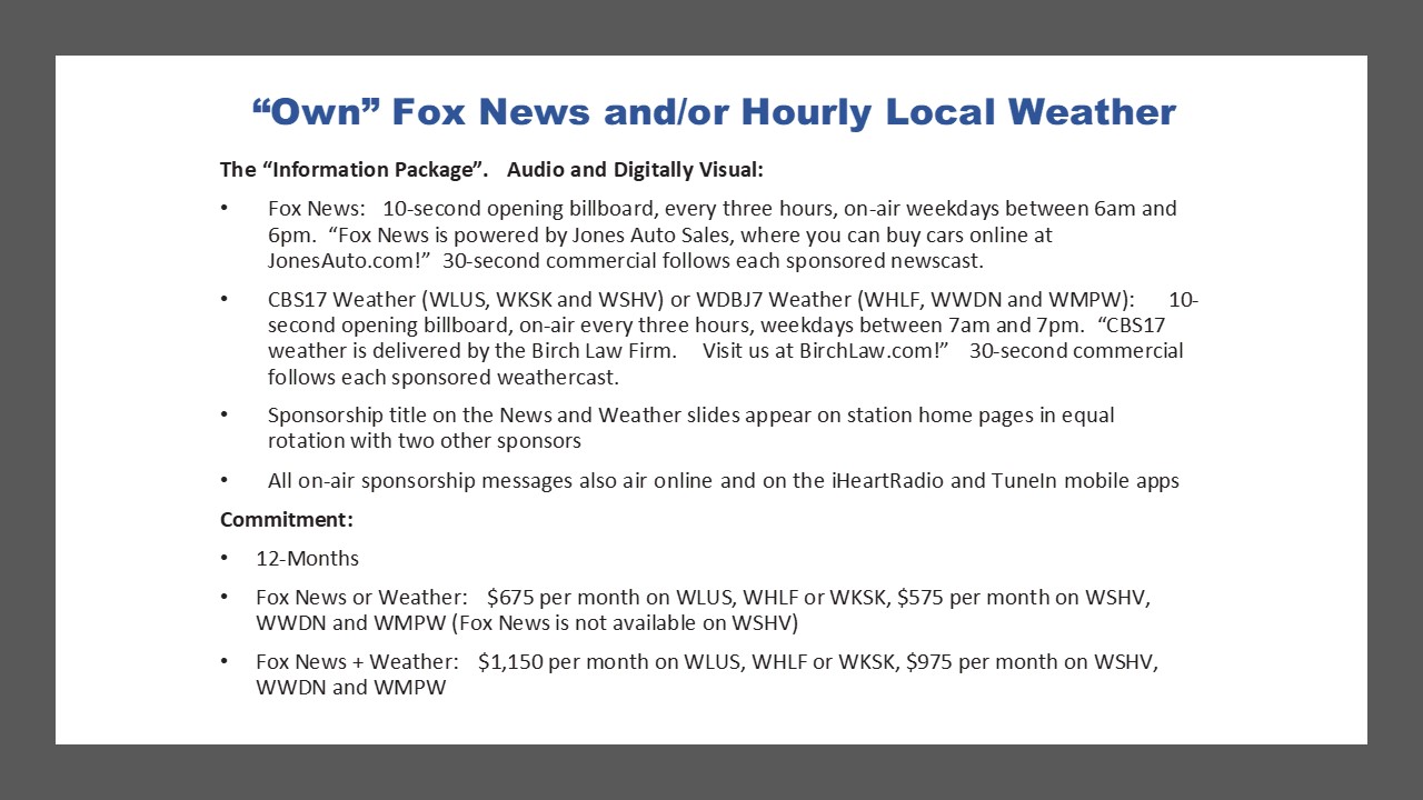 Sponsor Fox News and/or Local Weather on Lakes Media Network stations to maximize your business or brand name at times of peak listener awareness. Lakes Media offers an opportunity for advertisers to deliver a 10-second “billboard” before Fox Newscasts and/or Local Weather Reports four times per weekday between 6am and 7pm. Listeners will hear your sponsorship message (“Fox News is powered by Jones Auto Sales, where you can buy cars online at JonesAuto.com!”) and visitors to all Lakes Media station websites will see your sponsorship on the scroll at the top of station home pages 24/7. Visitors clicking on your image will be directed to your web page.