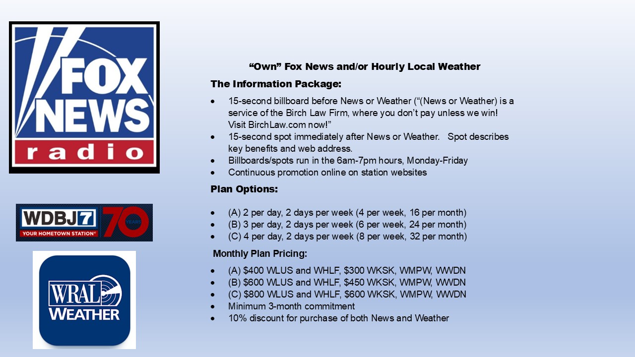 Sponsor Fox News and/or Local Weather on Lakes Media Network stations to maximize your business or brand name at times of peak listener awareness. Lakes Media offers an opportunity for advertisers to deliver a 15-second “billboard” before and 15-second “spot” after Fox Newscasts and/or Local Weather Reports weekdays between 6am and 7pm. Listeners will hear your sponsorship message (“Weather is powered by Jones Auto Sales, where you can buy cars online at JonesAuto.com!”) and a 15-second post-event ad. Visitors to Lakes Media station websites will see your sponsorship on the scroll at the top of station home pages 24/7. Visitors clicking on your image will be directed to your web page.